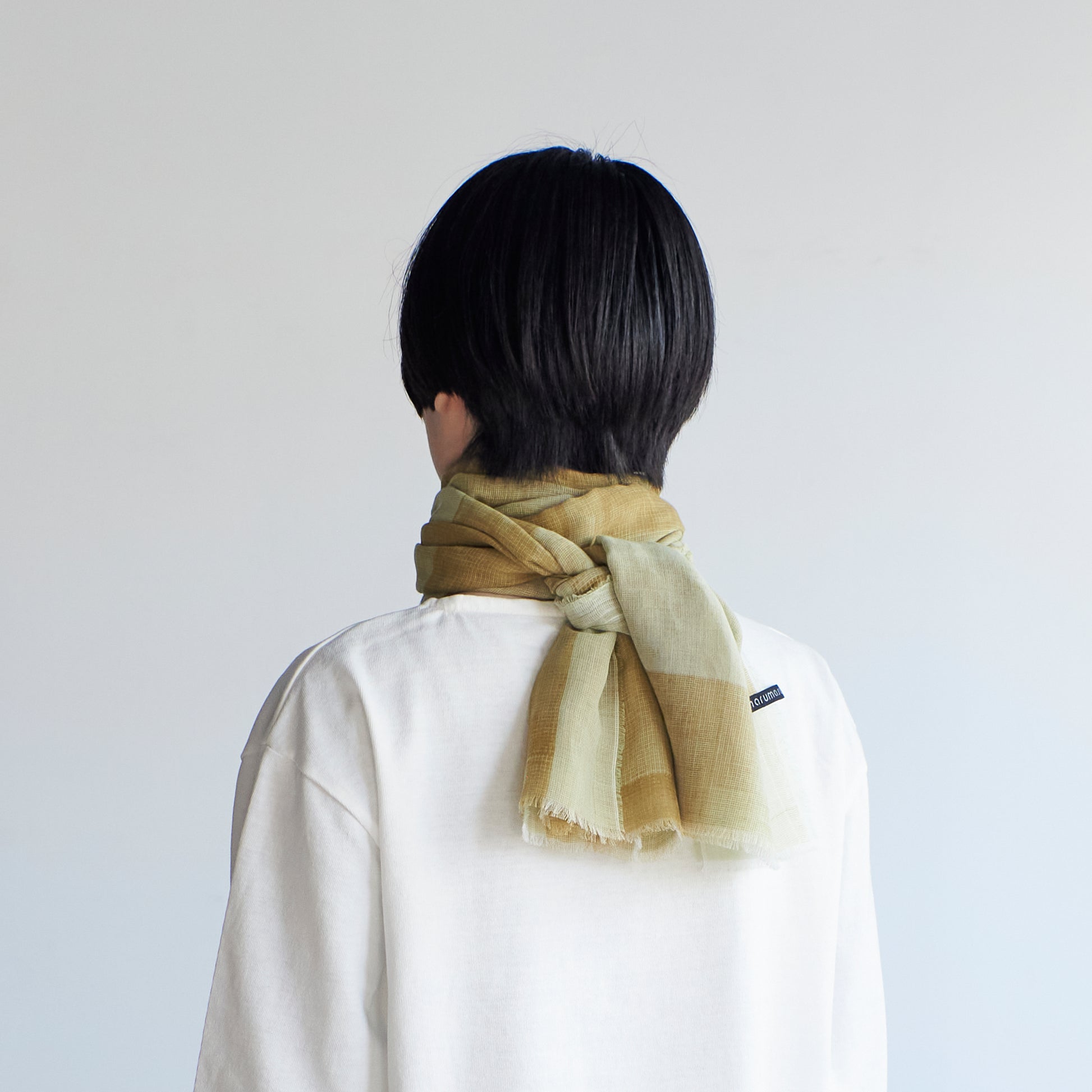 首元に巻いてもボリュームが出すぎず、コンパクトにまとまるため、シンプルな装いにも自然に馴染みます。