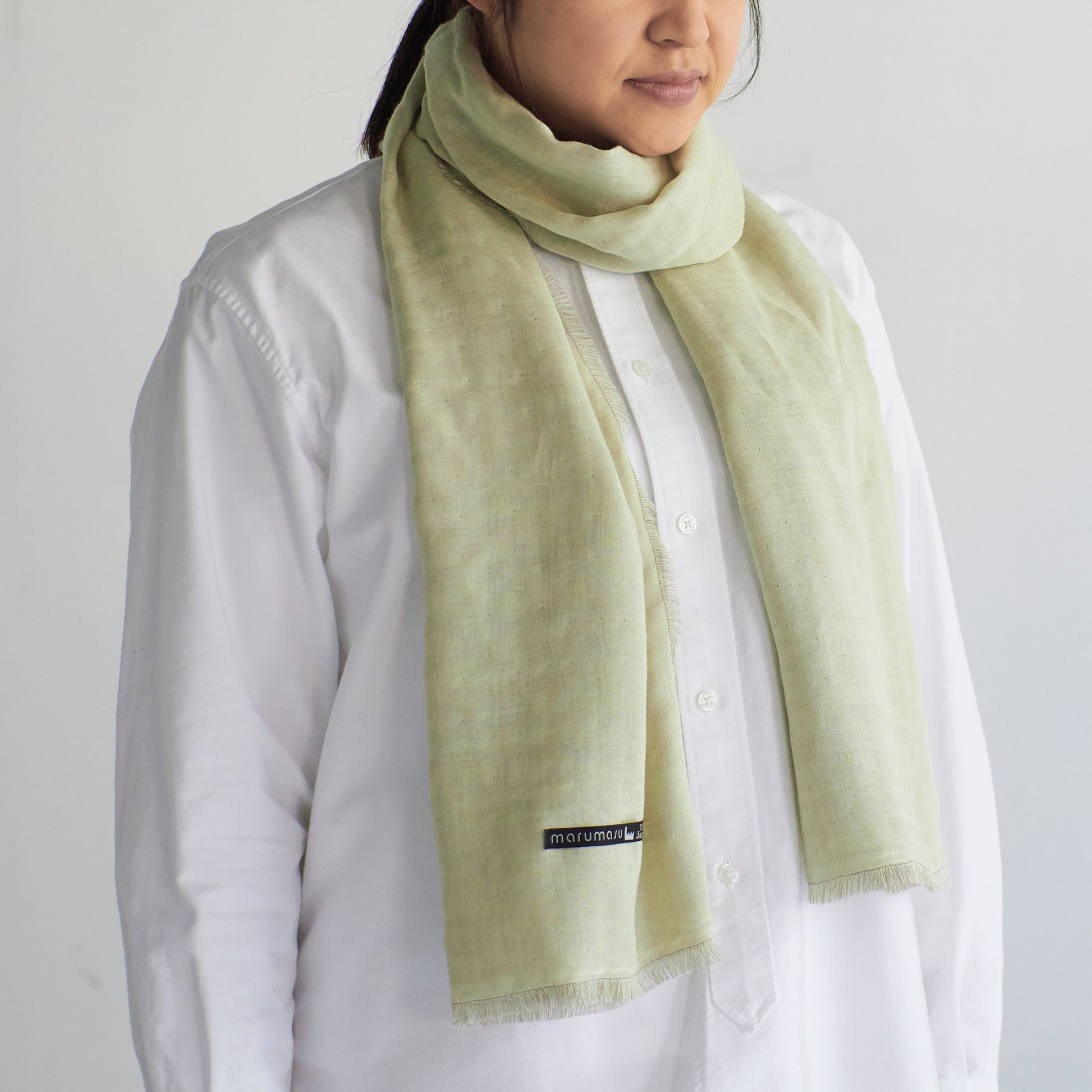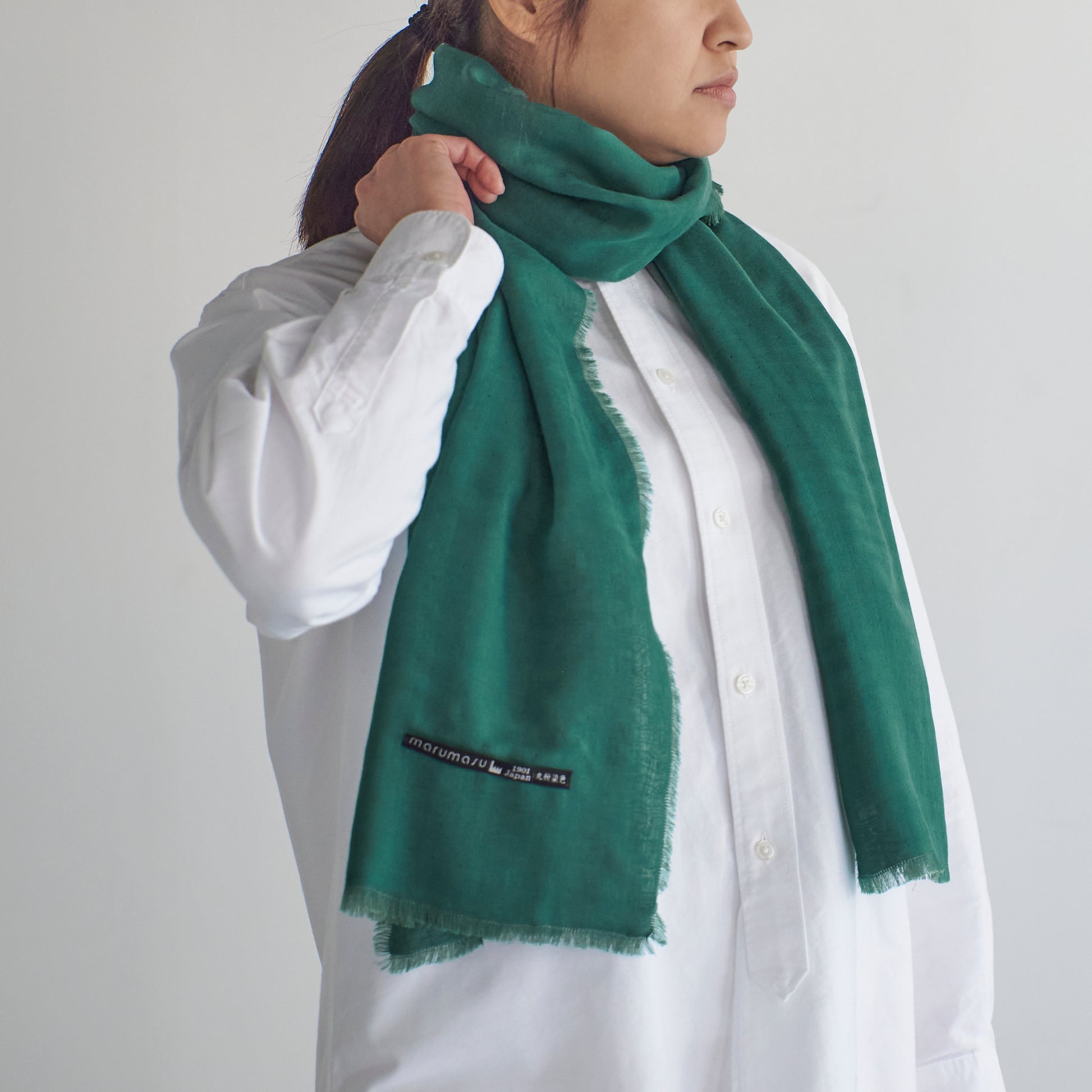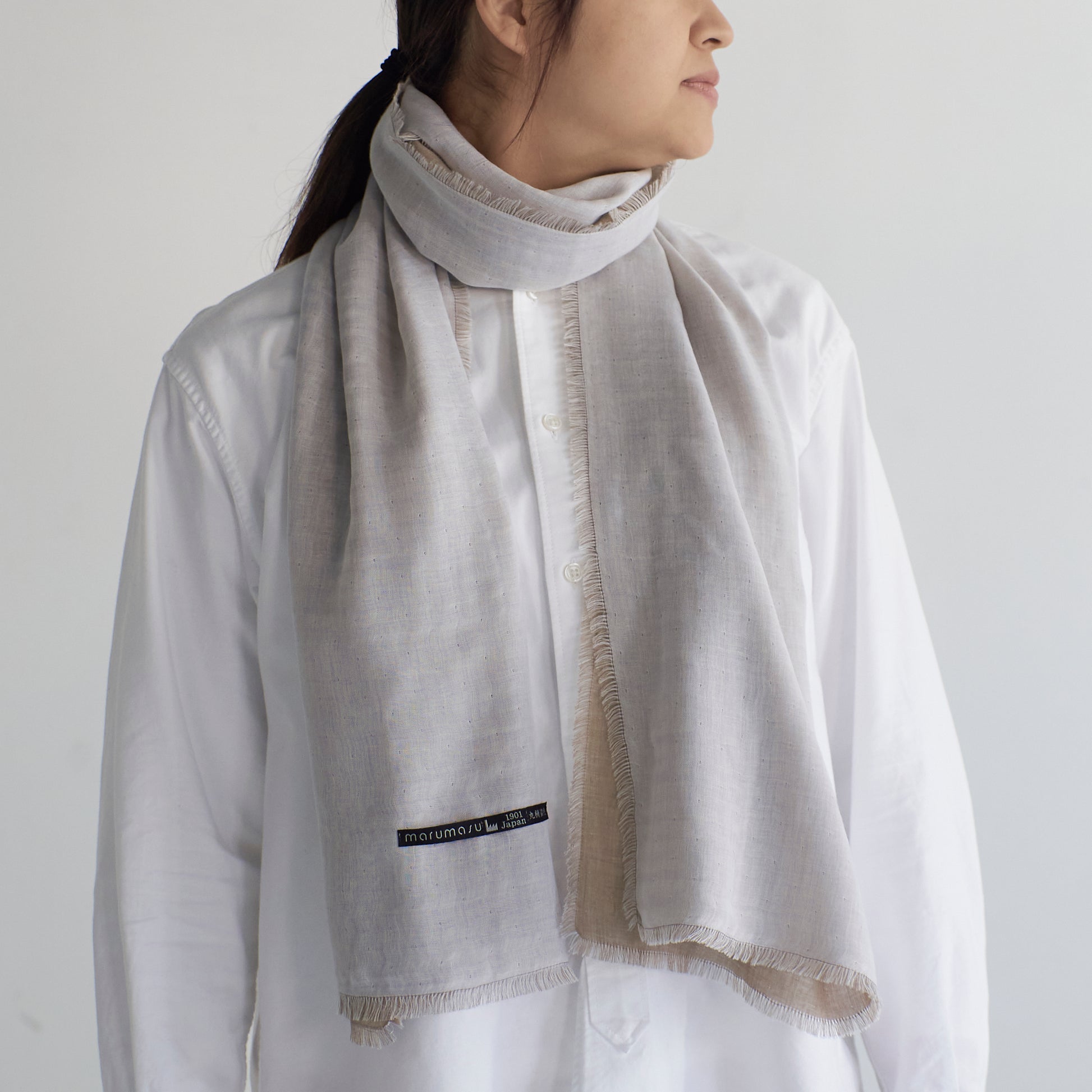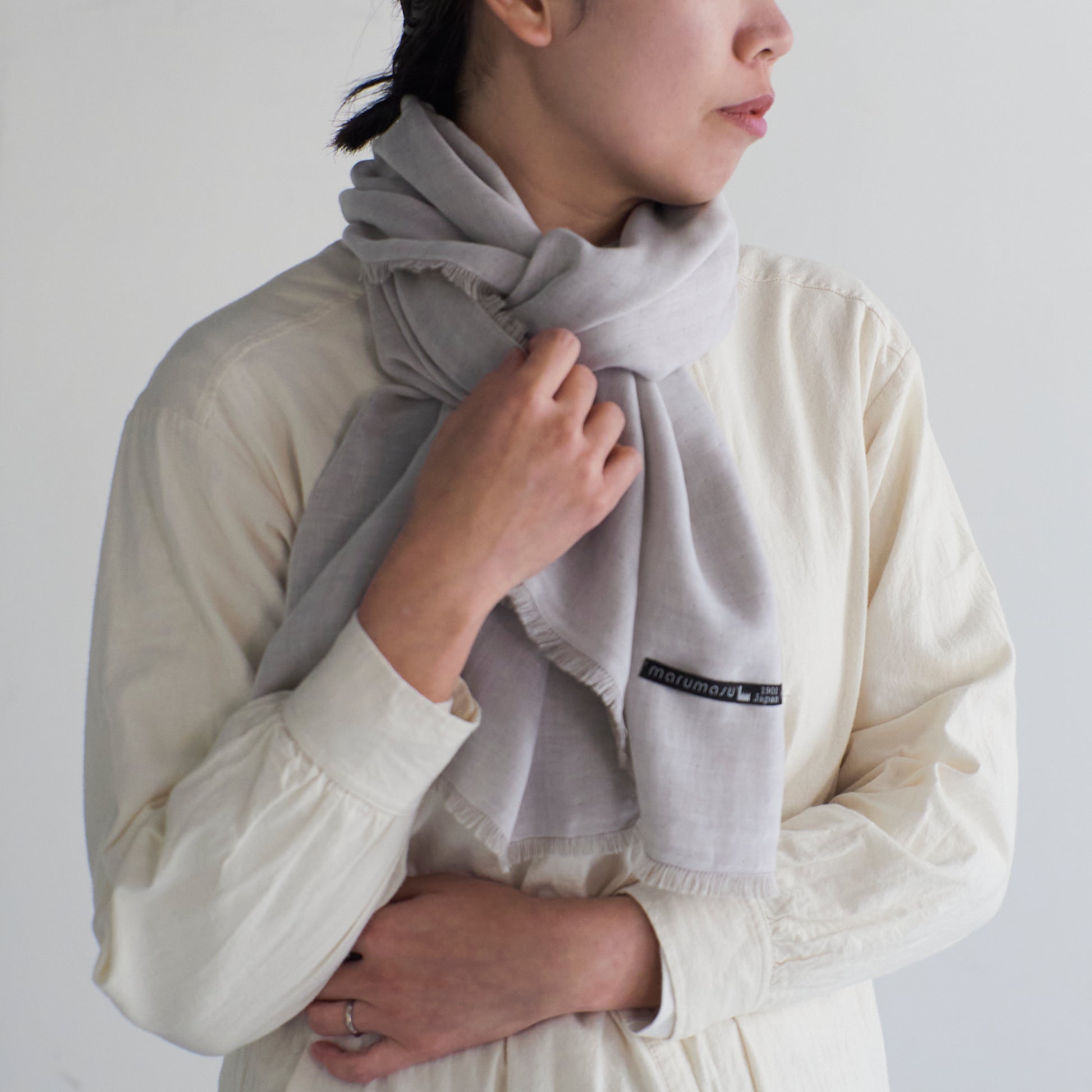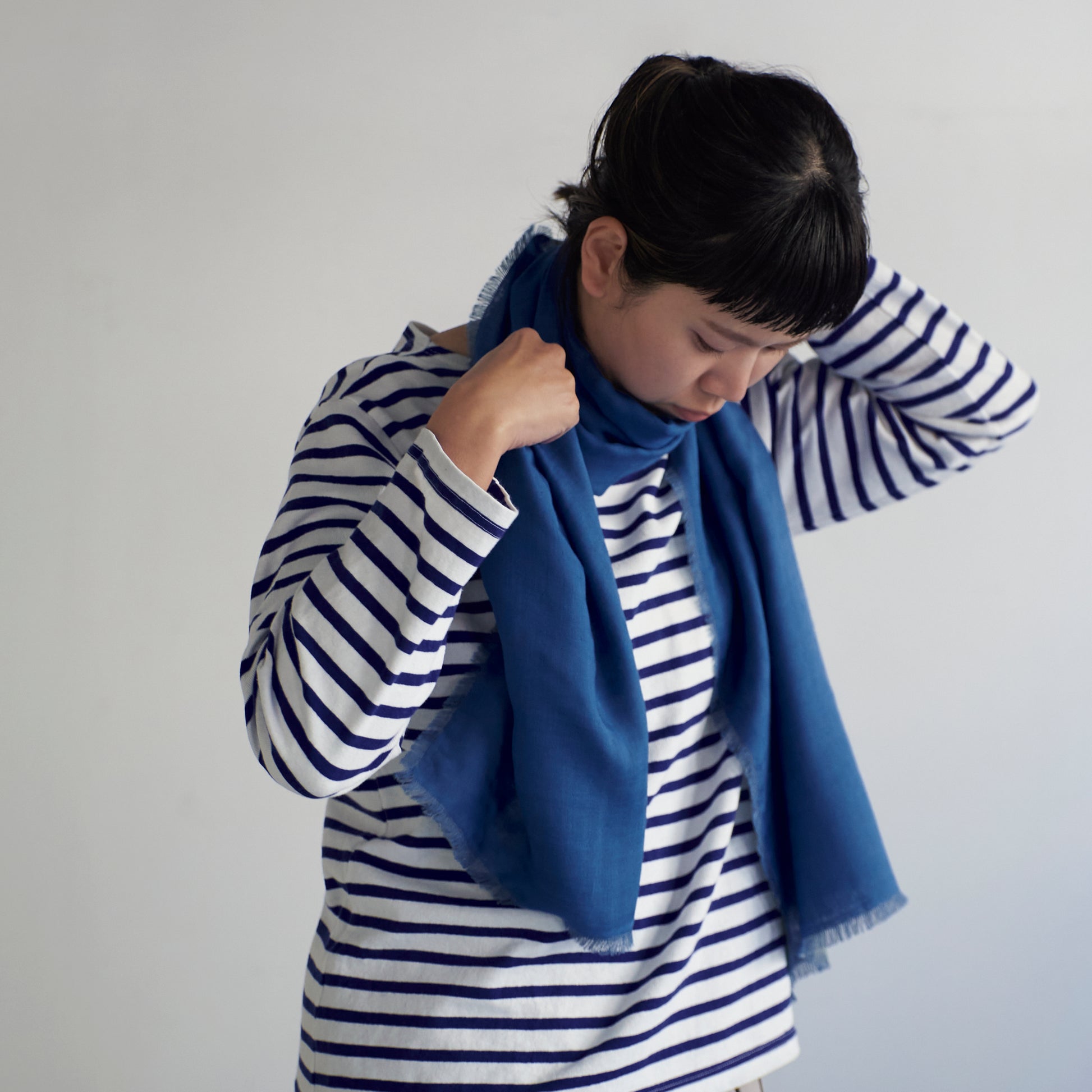 44cmの幅は気温差の激しい季節の変わり目にも程良いサイズで、収縮性がないマフラーと比べてドレープを活かして空気を含むようなふんわりとした巻き方がしやすく、どなたにも簡単にお使いいただけます。