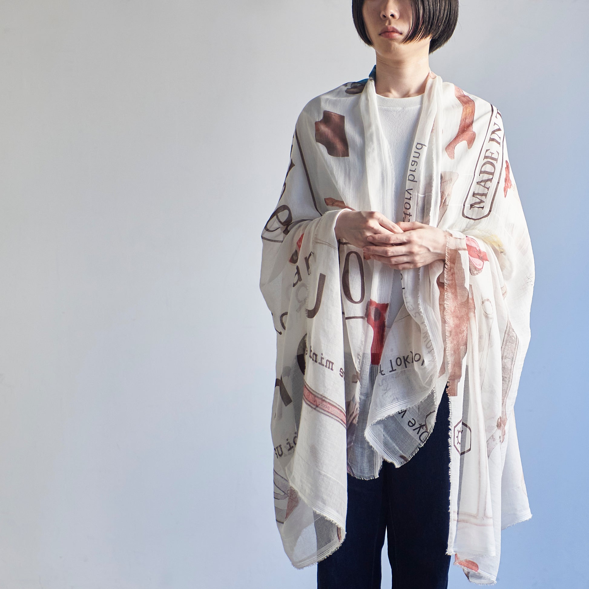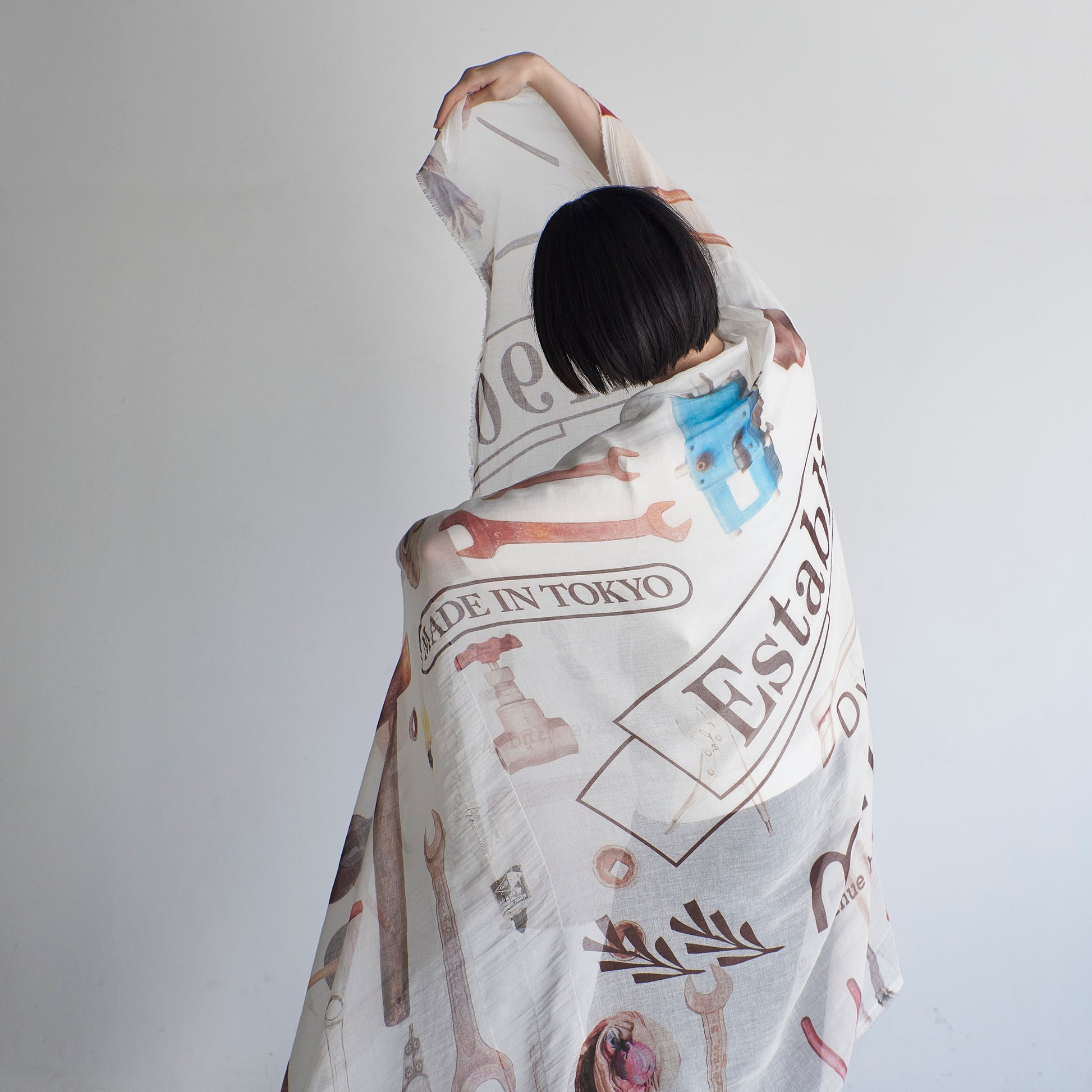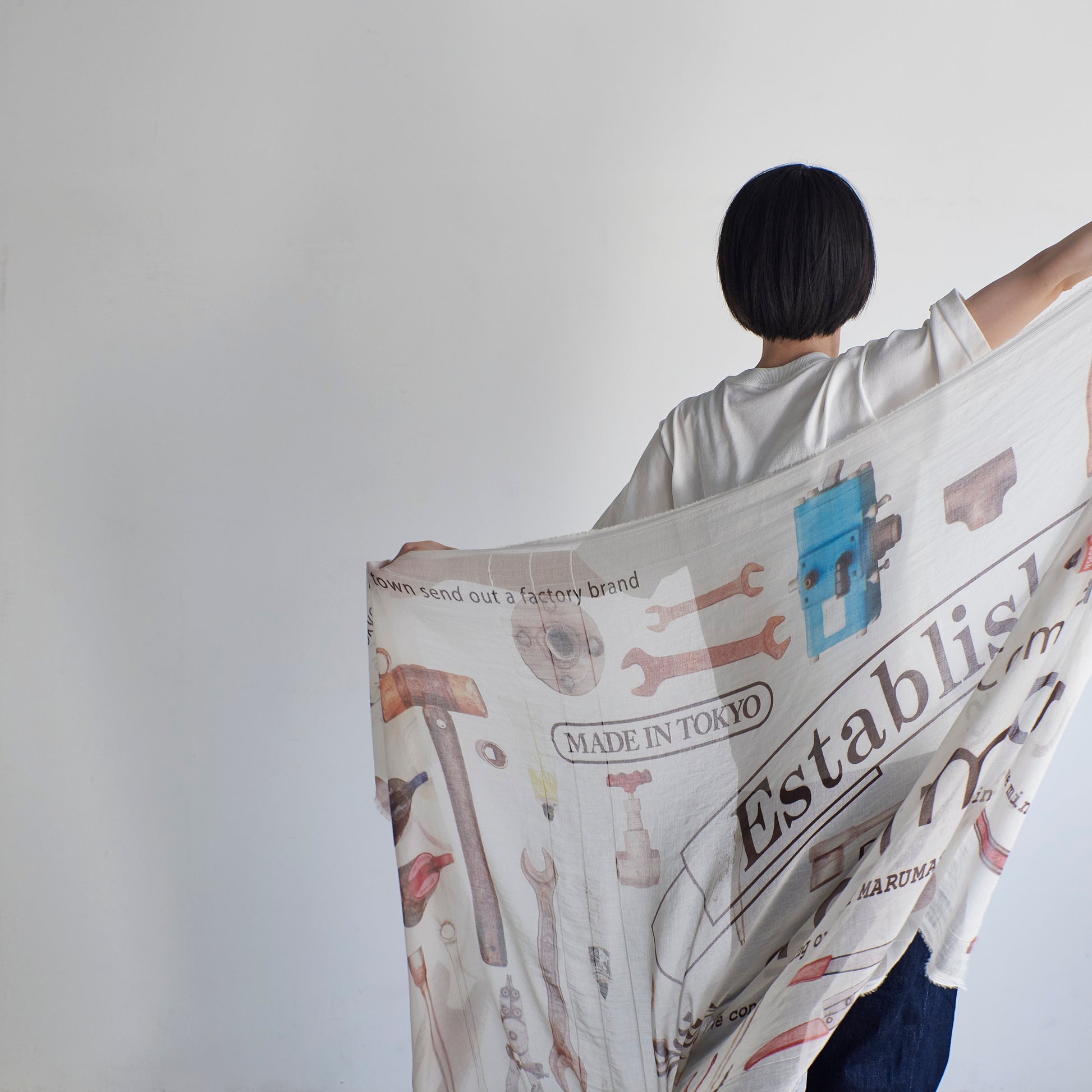 私たちの工場、丸枡染色で実際に使われている染色道具や部品をモチーフに、グラフィカルにデザインされた大胆な総柄が特徴。染色の現場から着想を得たパターンは、どこかノスタルジックでありながら、モダンで個性的な印象も与えます。裁断位置によって1枚1枚異なる表情に仕上がります。同じデザインでも、世界にひとつだけの風合いを楽しめるのが魅力。ひとつのアート作品のように、眺めても、身につけても楽しめる一枚です。