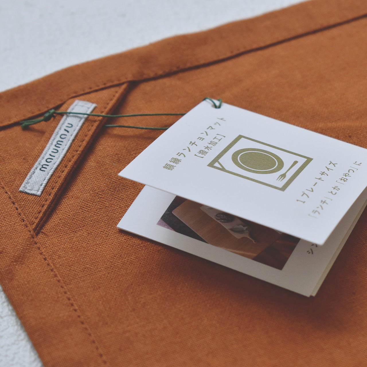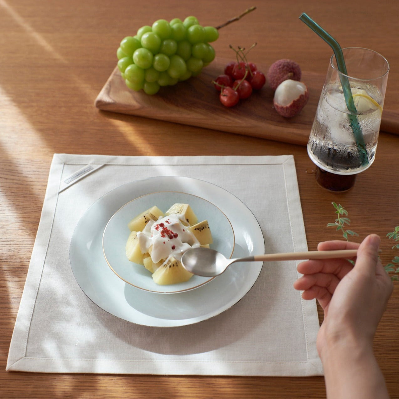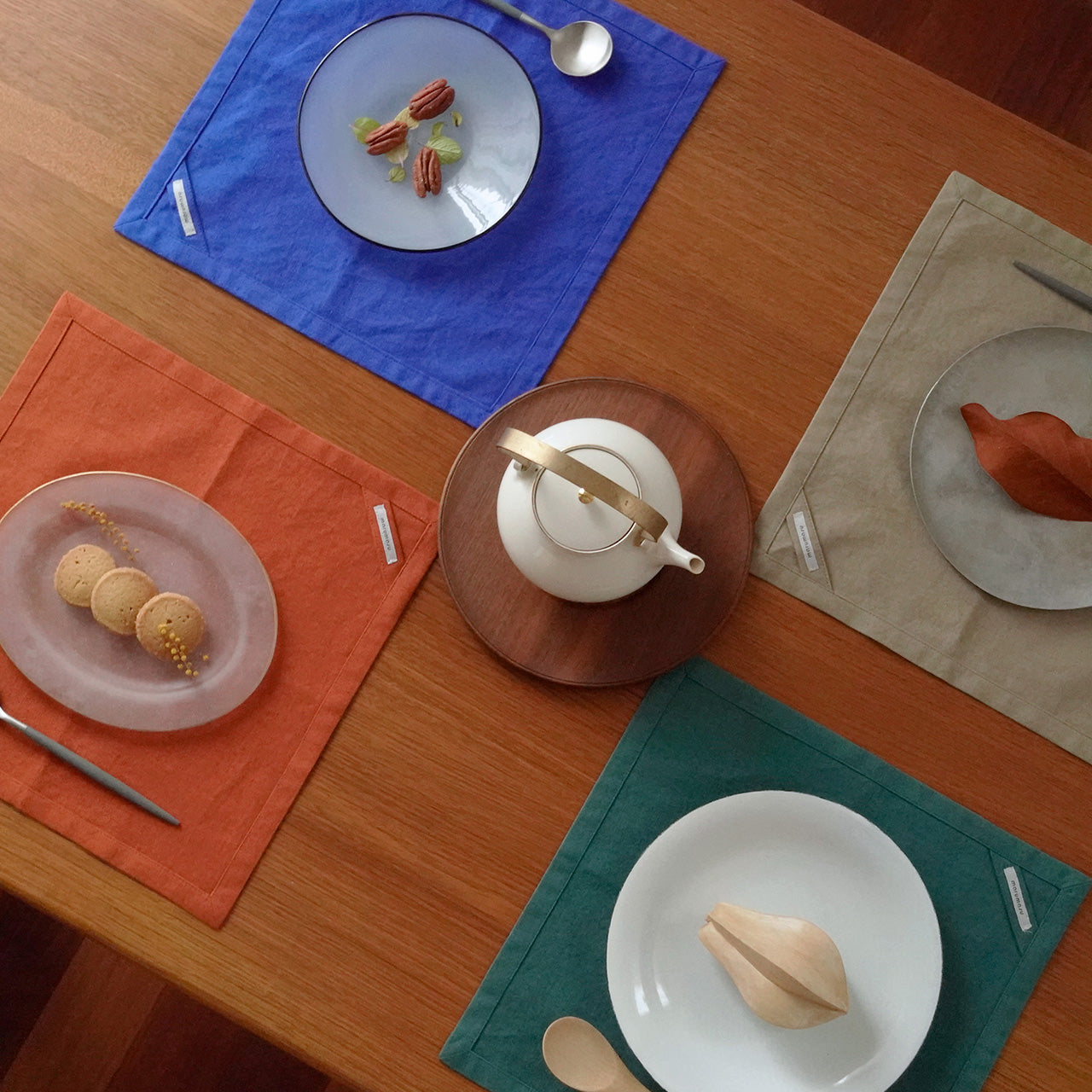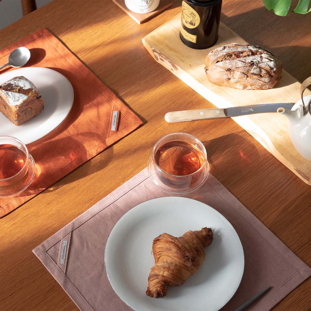 ロゴが入ったテーブルと無地の裏、それぞれリバーシブルで使って頂けます。ワンプレートがぴったりなので、朝食やおやつの時間にお勧め