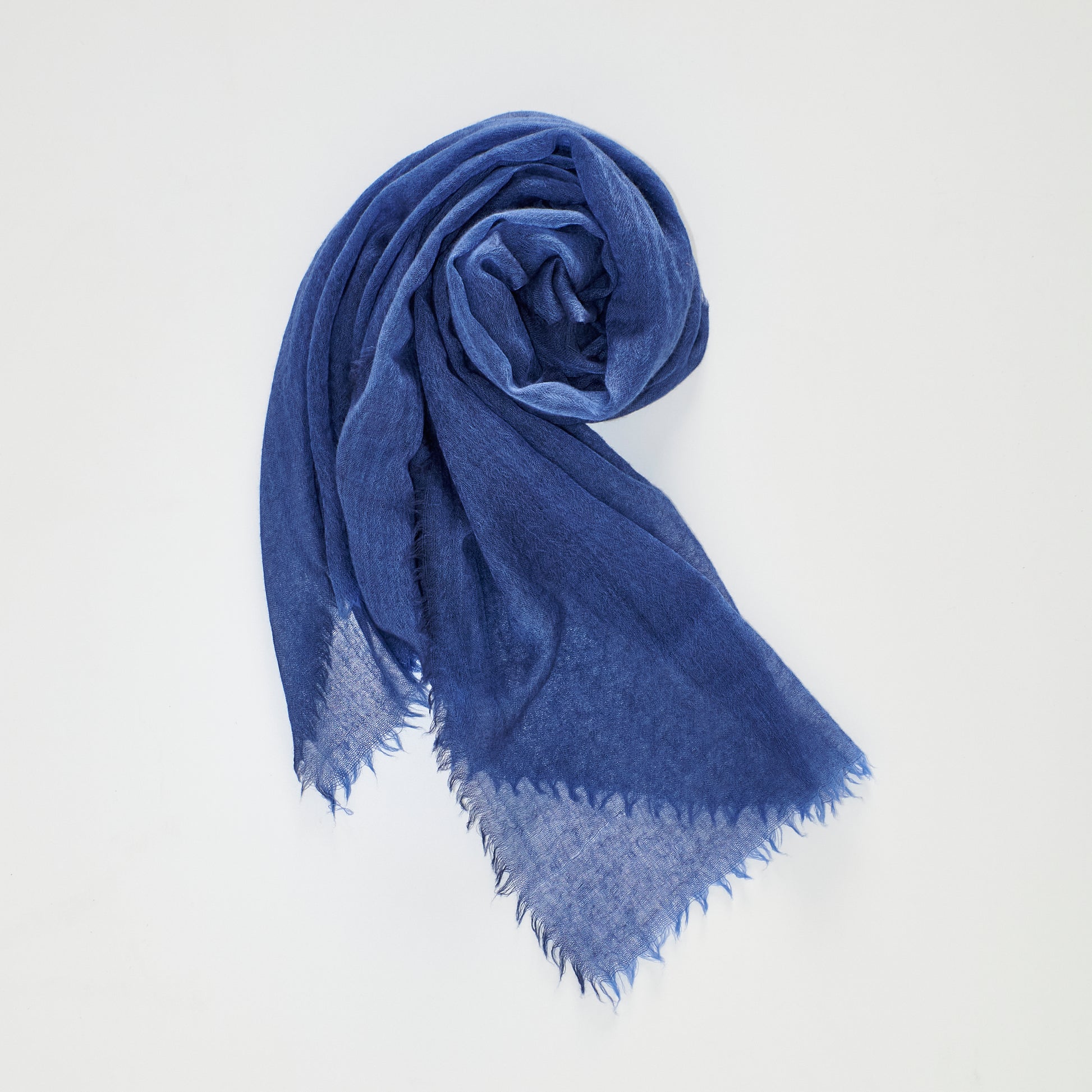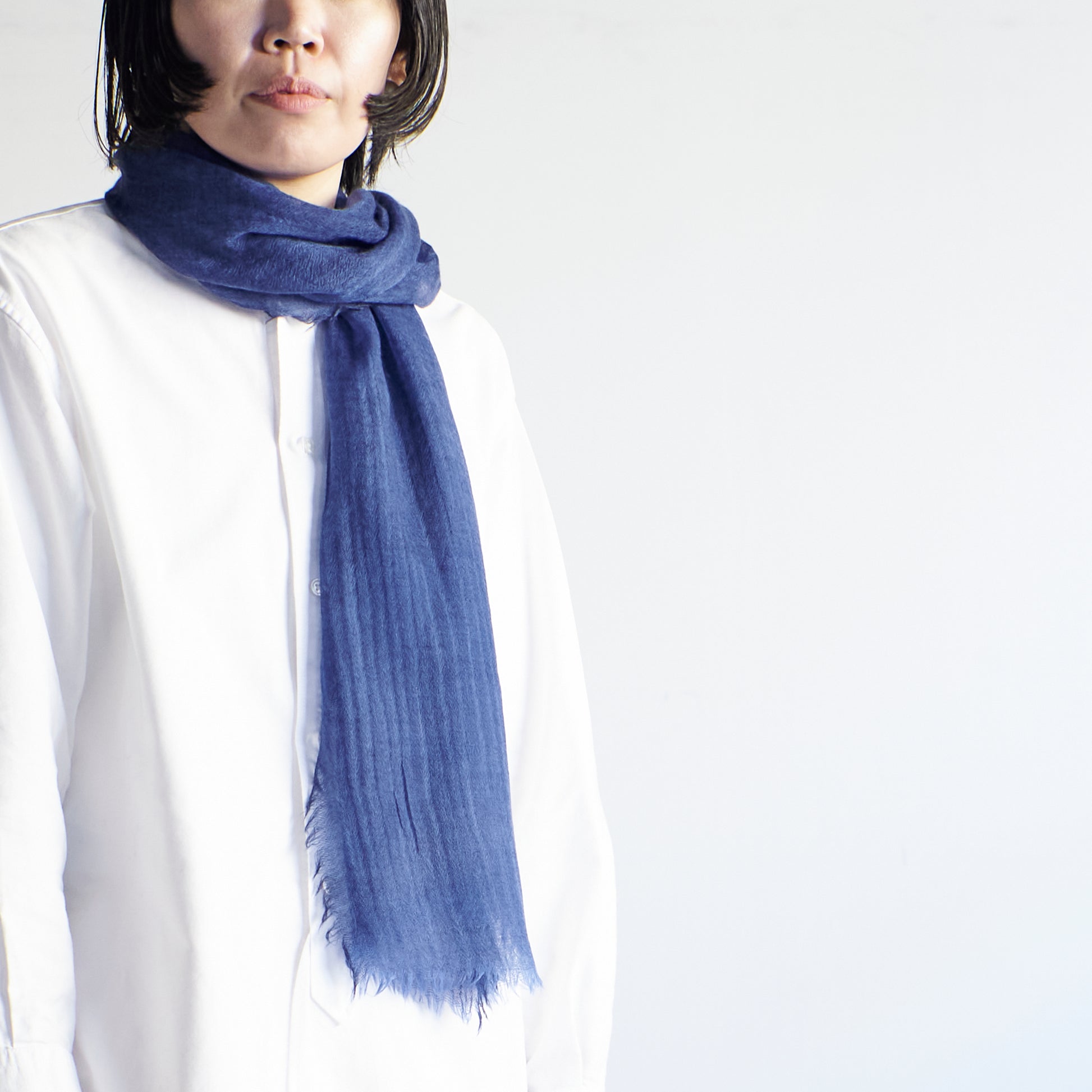 一度染めのタテと、二度染めたヨコの深みのある色合いの違いを見て、巻いて、羽織って楽しんでください。